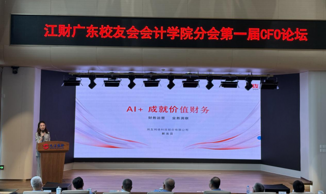 在两位知名教授分享后,用友的财务专家郭洺贝女士以《AI+成就价值财务》为题,探讨企业如何构建“AI+财务”的落地路径与应用场景,借助AI大模型实现企业的高效运营、精益管理、优化资源与精准风控。